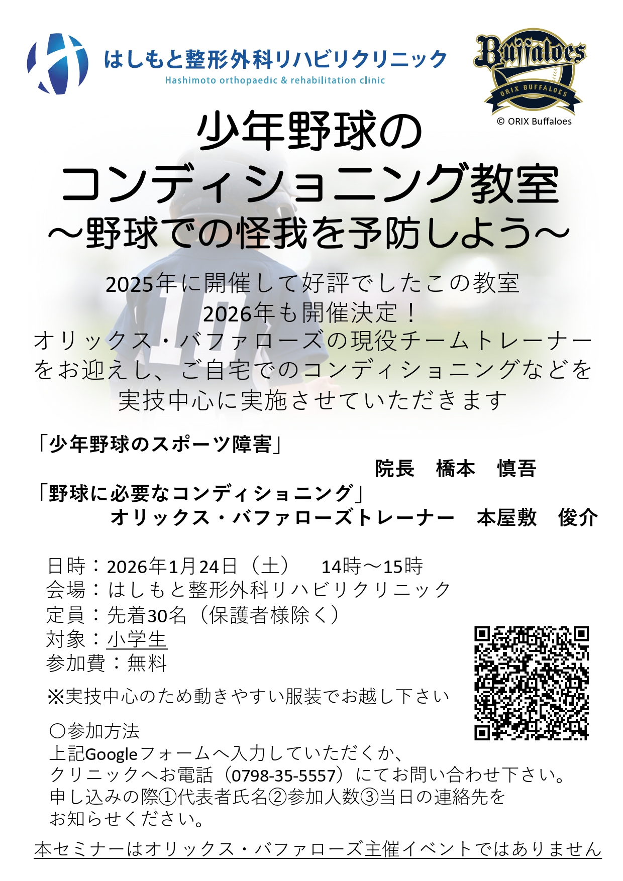 2026年1月24日(土)に少年野球に必要なコンディショニング教室を開催します。 特別講師として、オリックス・バファローズの現役トレーナーである本屋敷俊介さんをお招きしての2回目の開催となります。 現役プロ野球トレーナーから直接お話を聞ける貴重な機会ですので、皆さん、奮ってご参加下さい。